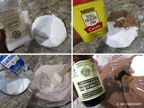 In a large bowl, combine the flour, sugar and cocoa. Add the milk and vanilla.