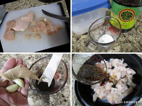 Chop the chicken into bite-sized pieces. Set aside. In a medium bowl, make the marinade for the chicken by mixing together two tablespoons of soy sauce with the sugar, garlic and ginger. Toss the chicken in this marinade, cover and chill for at least 30 minutes.