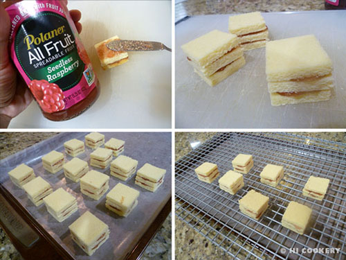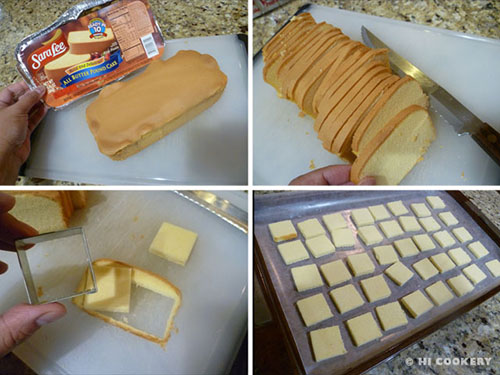 Thaw the pound cake in the refrigerator overnight but keep it chilled for easier slicing. Slice down the pound cake about ¼ – 1/3 inches thick. Discard the ends. Using a 1 ½-inch square cookie cutter, cut out two squares per pound cake slice.