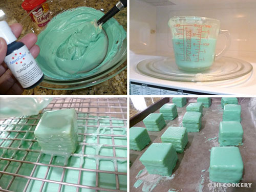 - Change the colors of the poured frosting and fondant for other party presents petit fours.