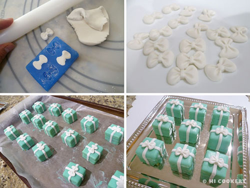 Inspired by Tiffany’s iconic blue package with white bows, we made engagement box petit fours to mark the company’s founding date. These petit fours are perfect for serving at engagement parties and bridal showers.