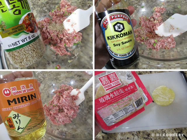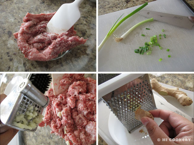 In a bowl, mix the ground meat with the chopped green onions. Add the garlic and ginger.