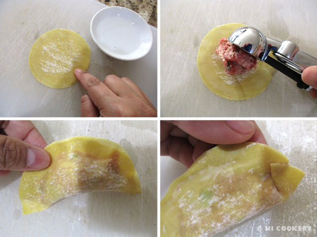 Moisten the edges of the wrapper with a little water. Scoop a tablespoon of filling onto the center. Fold over into a half circle and seal.