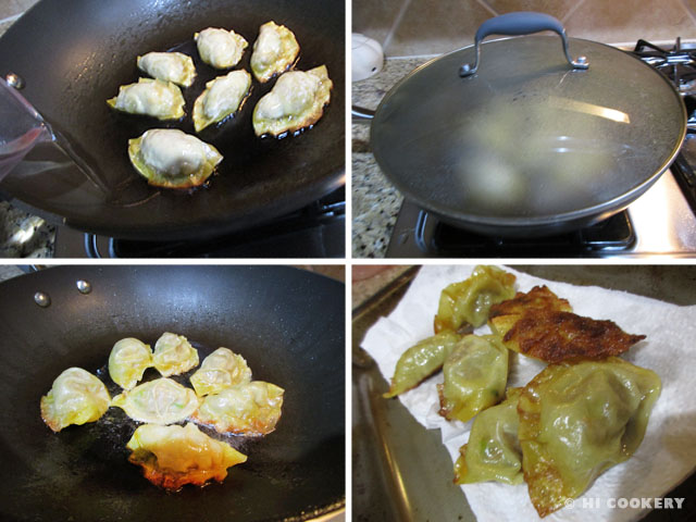 In a skillet, cover the bottom with a very thin layer of vegetable oil. When it is hot, turn down to medium heat and carefully slip the potstickers in the skillet. Avoid overcrowding and overlapping so they do not stick together. Fry until the bottom is slightly browned (about 2-3 minutes). Do not turn over. Pour the water carefully (it will sizzle and splatter a bit). Cover the skillet immediately. Steam until the water has almost evaporated (about 4-5 minutes). Remove the cover and continue heating the potstickers until the filling is cooked through. Transfer the potstickers onto a paper towel to drain. Serve hot with soy sauce or dipping sauce.