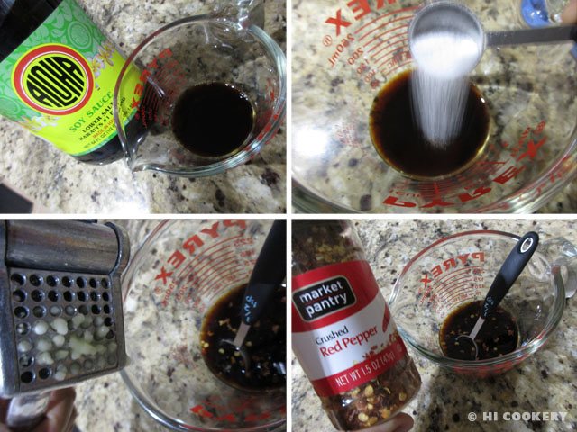 In a measuring cup, combine the soy sauce, rice vinegar and sugar. Stir in the minced garlic.