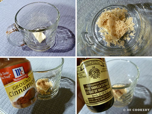 In the bottom of a mug, place the butter. Sprinkle with brown sugar and dash of spices (cinnamon and/or nutmeg). Add the vanilla.