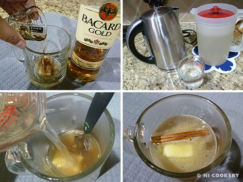 Pour in the rum and meddle the ingredients together. Pour in the hot water and stir. Garnish with a cinnamon stick. Serve hot. Yield: 1 serving