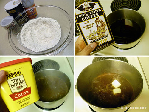 In a bowl, combine the flour, baking powder, baking soda and salt. Set aside. In a saucepan over medium heat, mix together the coffee and cocoa. Add the butter and stir until melted.