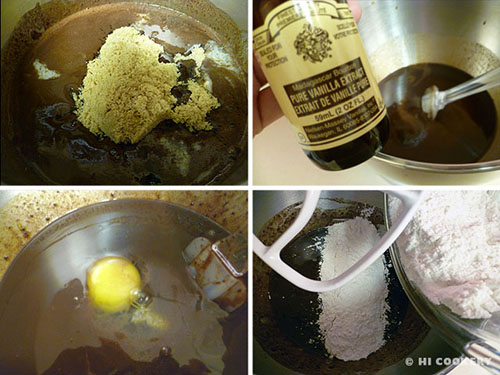 Add the brown sugar and cool to room temperature before beating in the eggs. Stir in the vanilla. Gradually add the flour mixture and stir until the batter is smooth.