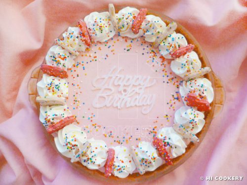 Swirl some whipped cream on the edges of the frozen pie (we used Wilton tip 1M and a decorator’s piping bag). Sprinkle some colorful non-pareils on the pie. Garnish with frosted pink and white animal cookies. Freeze until ready to slice and serve.
