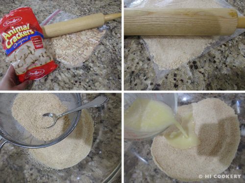 Crush the animal crackers (pulse in a food processor or place in plastic bag and crush with a rolling pin) into a fine powder. Place the crumbs in a large mixing bowl. Stir in the butter and honey and mix until everything comes together.