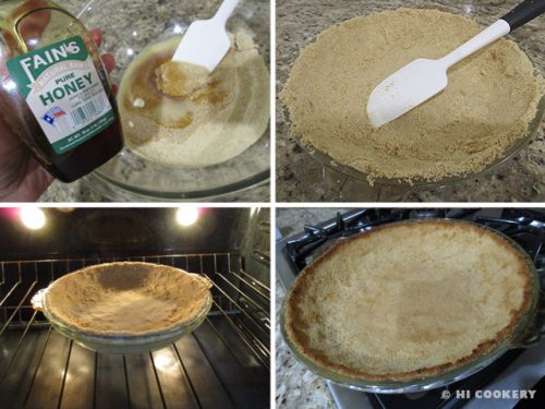 Press in a 9 or 10 inch pie plate, covering the sides and bottom well. Bake in a preheated oven at 425 degrees F for 10 minutes or until lightly golden. Remove from oven cool completely on a wire rack. Freeze the pie crust to make it firmer (optional).