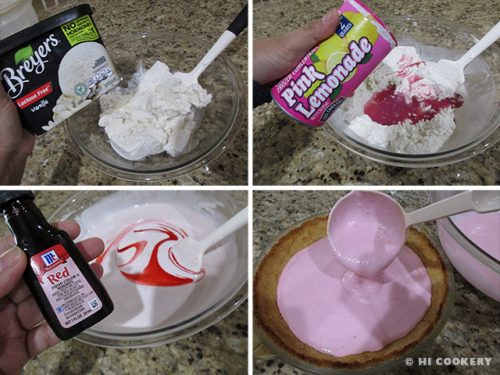 In a large bowl, mix together the vanilla ice cream with the pink lemonade (½ – 1 can according to tartness and taste). Add a few drops of red food coloring to get the desired shade of pink. Spread the filling mixture into the pie crust. Cover and freeze until firm.