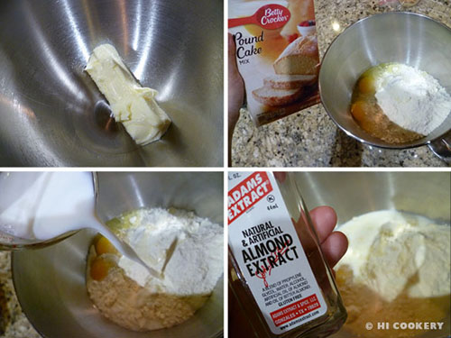 Prepare the pound cake mix according to the directions on the box. In a mixing bowl, combine the pound cake mix with the butter, eggs and milk. Add the almond extract.