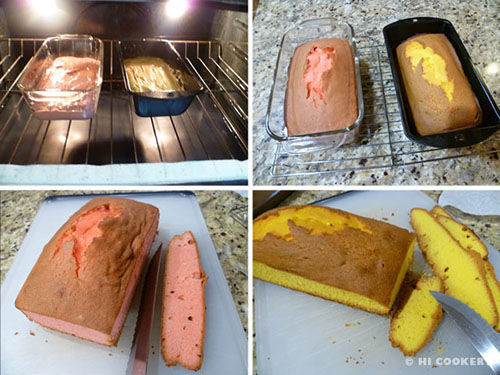 Mix until the batter is smooth. Divide the batter equally in two bowls. Tint one with red food coloring and stir until the batter is pink. Tint the other with yellow food coloring and mix well. Pour each into two separate, same-sized greased loaf pans.