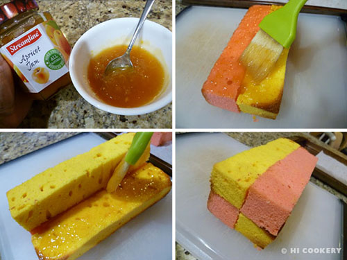 Stir the apricot jam in a small bowl until smooth. Generously spread the jam on one side of the cake strip. Attach an opposite colored cake strip to the side. Brush more jam on the top of the two cake strips. Repeat with the other cake strips, topping them with opposite colors. Brush all crumbs away and spread more jam on the sides, including the top and bottom of the cake.