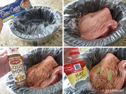 Line the crockpot container with slow cooker bags for easier cleanup. Place the beef brisket in the container, fat side up. Pour in the liquid smoke. Add the bay leaves.