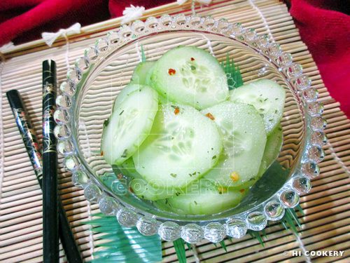 Stir in the sugar, water, salt and red pepper flakes. Toss in the cucumber. Sprinkle dried mint or parsley. Cover, refrigerate and allow the flavors to set for at least half an hour.