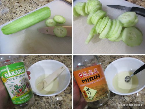 Wash and peel the cucumber. Cut into thin slices. Set aside. In a large bowl, mix the rice wine vinegar with the mirin or sake.