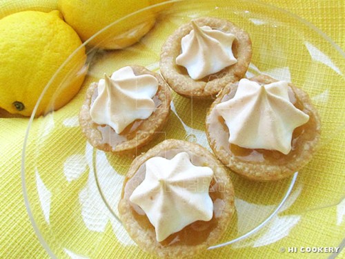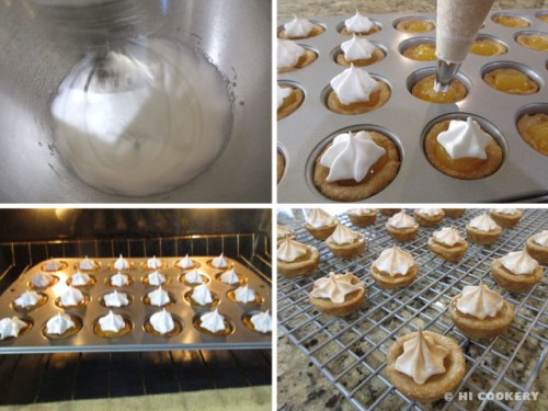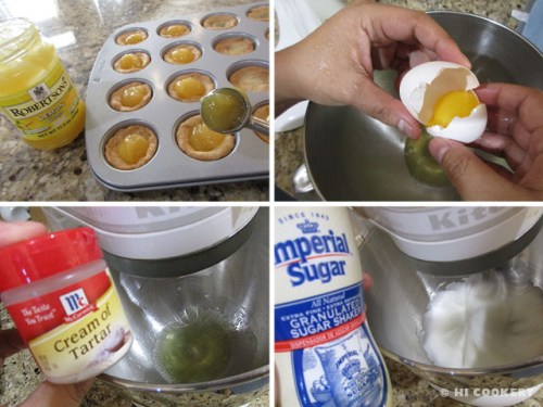 Fill the crusts with a teaspoonful of lemon curd. In a mixing bowl, beat the egg whites with a pinch of cream of tartar until foamy. Continue beating the egg whites and gradually add the sugar until stiff peaks form.
