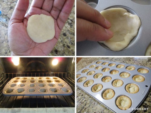 Flatten, press and shape the crusts in the wells of an ungreased muffin pan. Bake in a preheated oven at 350 degrees F for 10 minutes. Remove from the oven and cool completely.