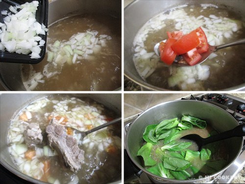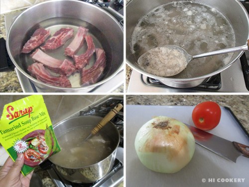In a large pot, boil the ribs in water then simmer for about 1-2 hours to tenderize the meat. Skim off the scum. Mix in the sinigang packet. Chop the onion and dice the tomatoes.