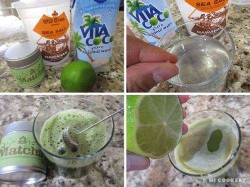 In a small glass, pour the coconut water. Add a pinch of sea salt. Mix in the matcha. Spritz a little lime juice and stir. Garnish with a lime slice or wedge.