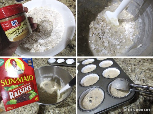 Stir in the pumpkin pie spice or ground cinnamon. Stir in the wet ingredients and mix until moistened. Fold in the raisins. Scoop the mixture into cupcake papers.