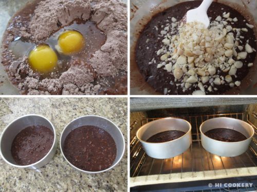 Beat in the eggs and oil. Add the chopped, cooled nuts. Divide the brownie batter into two greased 8-inch round pans. Bake in a preheated oven at 350 degrees F for 25 minutes. Remove from the oven and cool completely. Horizontally slice the brownies in half to make four layers. Place the bottom layer on a cake plate, board or platter. Set aside the three other layers.