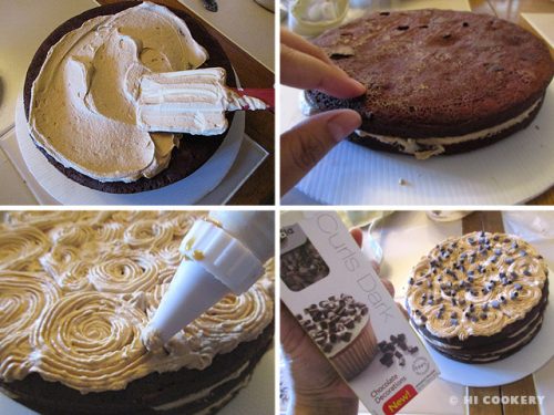 Spread a quarter of the filling mixture on the bottom layer of the brownie. Place a brownie layer on top. Spread another quarter of the filling mixture onto this layer. Place another brownie layer on top. Repeat with the last layer. Frost the top layer with the remaining filling (or decorate with swirls using a star tip). Sprinkle the top with chocolate curls or chips. Cover and refrigerate to set. Before serving, remove from the refrigerator and let thaw for about 10 minutes. Slice and serve.