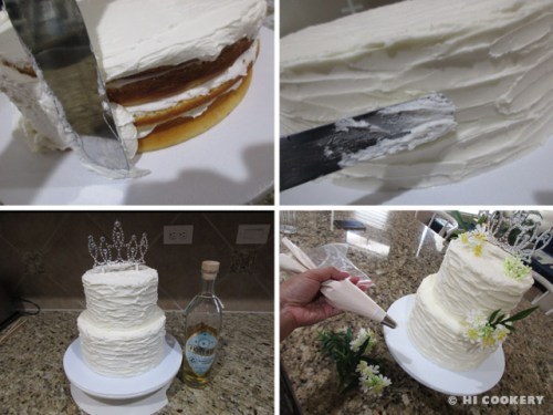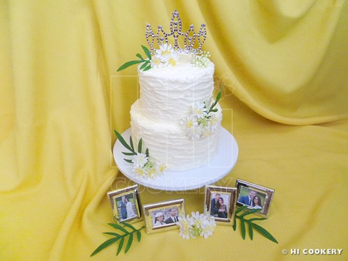 There are many recipe versions of lemon elderflower cake but we tried the one published in People magazine. Their version is heavy and dense, unlike the light and fluffy cakes that we are used to. It is both rich and refreshing, which is befitting for a royal dessert. We also thinned down the basic buttercream recipe with elderflower liqueur but the floral flavor is faint. We could not find fresh elderflowers to decorate the cake, so we used silk spring flowers with yellow centers instead to indicate the lemon flavor with this color. Lastly we topped our simple, rustic-style cake with a tiara to add some “Markle sparkle”.