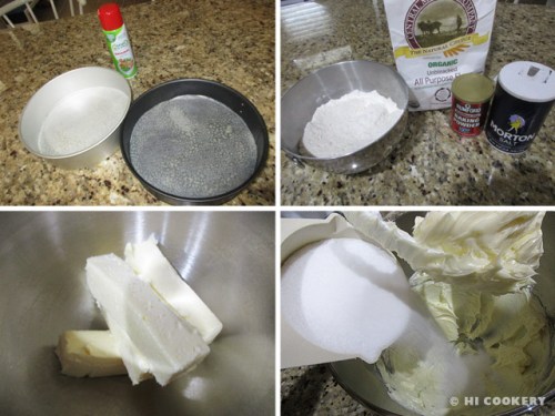 Line two 6- and 8-inch round cake pans with waxed paper. Mist the bottom and sides with cooking spray. Set aside. In a large bowl, combine the flour, baking powder and salt. In a mixer, beat the butter until creamy.