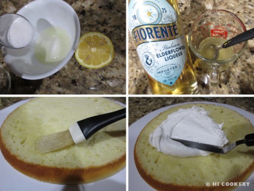 In a small bowl, dissolved the sugar in lemon juice and elderflower liqueur. Stir well. Brush this liquid onto the cut layers of the cooled cakes before icing them with elderflower buttercream frosting.