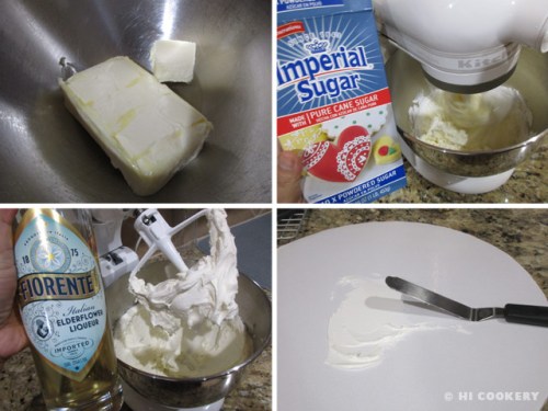 In a mixer, beat the butter until creamy. Gradually add powdered sugar. Thin to a spreadable consistency with elderflower liqueur. Spread a little frosting onto a cake board to act as a “glue” for the bottom layer of the cake.