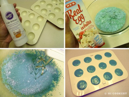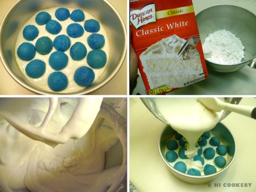Line two 8-inch round pans with waxed paper. Mist with cooking spray. Arrange blue cake balls in the pan. In a mixing bowl, combine the white cake mix, water, vegetable and egg whites. Blend until smooth. Divide batter into two. Pour over the cake balls in each pan.