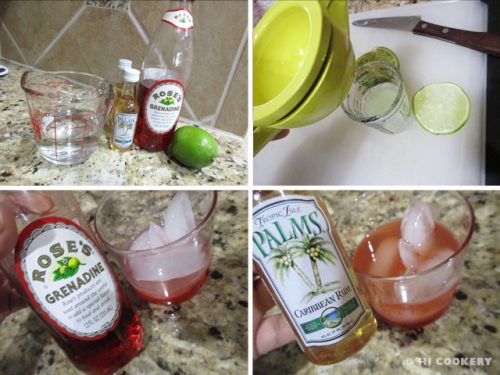 Slice the lime(s). Reserve a few for garnishing the glass (optional). Squeeze out the lime juice. In a glass, fill halfway with ice cubes. Pour in the lime juice. Add the grenadine or simple syrup. Stir in the rum and cold water. Garnish with a slice of lime.