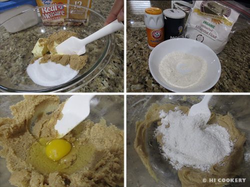 In a bowl, sift together the flour, slat and baking soda. Set aside. In a large mixing bowl, cream the butter with the white and brown sugar. Beat in the egg. Gradually add the flour mixture and blend well.
