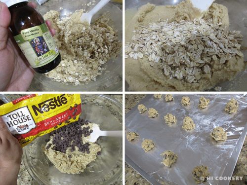 Stir in the vanilla. Fold in the oats and chocolate chips. Drop by tablespoonsful onto a lightly greased cookie sheet about two-inches apart to allow for spreading.