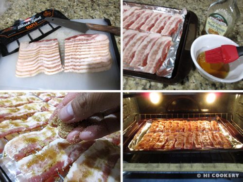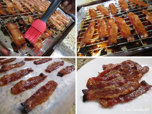 Line a jelly roll/lipped baking pan with foil and place a wire rack in the middle. Cut the bacon in half and place the slices on top of the wire rack. Brush with maple syrup. Sprinkle with brown sugar. Bake in a preheated oven at 400 degrees F for 10-15 minutes.