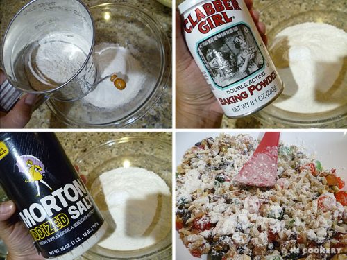 In a separate bowl, combine the flour, baking powder and salt. Pour over the mixed fruit and nuts and coat well.