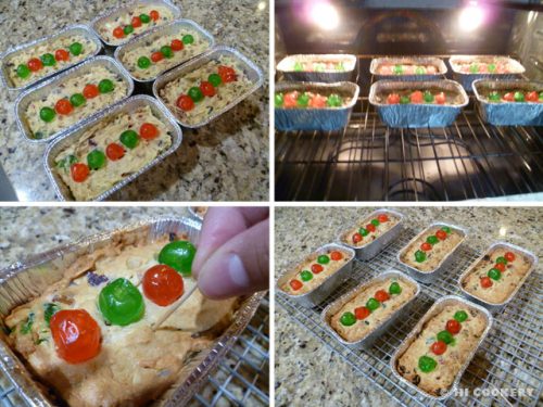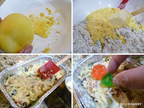 In another bowl, cream together the butter, sugar, eggs and grated lemon rind. Add the vanilla and lemon extracts. Mix this into the above until well blended. Divide the batter evenly into the wells of the mini loaf pan. Top with green and red candied cherries.