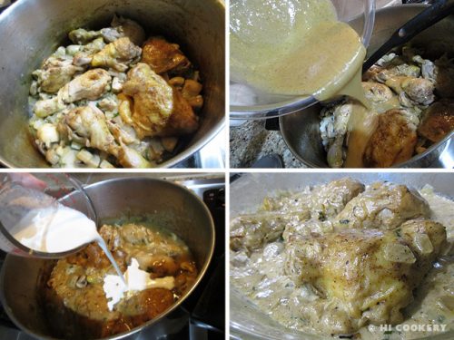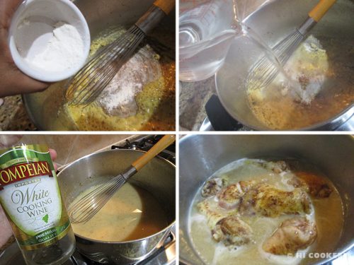 In the same pot, add the flour and cook in the chicken fat-oil until light brown, adding the water a little at a time to make a smooth sauce. Stir in the wine. Put the chicken back in the pot, cover, and simmer on low heat for 45-50 minutes or until the chicken is cooked through.