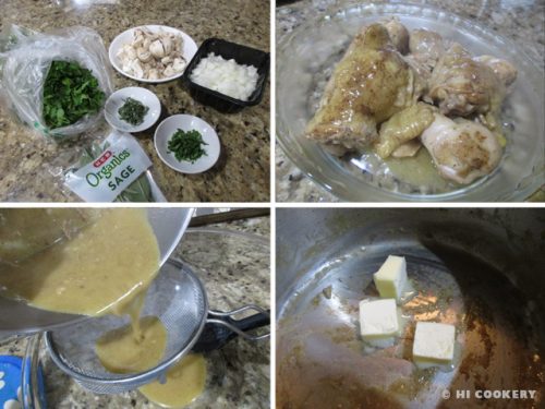 While the chicken is cooking, chop the onions, slice the mushrooms, chop the sage and parsley. When the chicken is cooked, transfer to a plate. Strain the gravy in a bowl and set aside. In the same pot, melt the butter over low heat.