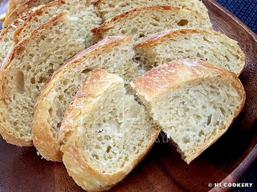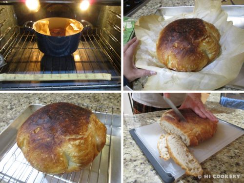 Remove the lid and bake uncovered for another 5-10 minutes to let the top brown. Take the Dutch oven out. Carefully dump the bread onto a wire rack to cool for another 20-30 minutes, discarding the parchment paper. Cool the bread. Slice and serve with butter, jam/jelly or flavored olive oil dipping sauce.