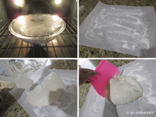 Cover the bowl with a plastic wrap and let the dough rest at room temperature or in a dark oven overnight. Dump the dough onto a lightly floured surface (we use parchment paper for easy cleanup). Use a bench scraper to fold over the dough about 4-5 times.