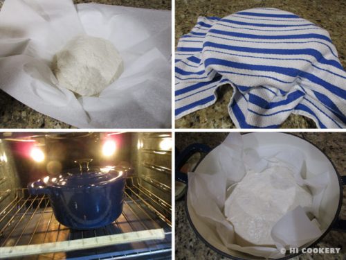 Pick up the parchment paper and place it all in a large bowl. Cover with a cotton (not terry cloth) towel and let rise at room temperature for two more hours. At least 30 minutes before baking, preheat oven to 450 degrees F. Place a Dutch oven, covered with lid, into the oven to heat it up. Use gloves to remove the Dutch oven and carefully open the lid. Pick up the whole parchment paper with the dough and dump it in the Dutch oven. Cover and return to the oven and bake for 25 minutes.