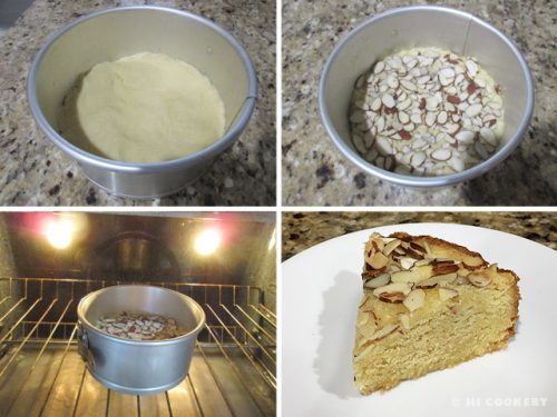 Gradually blend this into the butter mixture until smooth. The batter will be thick. Grease a 6-inch round cake pan. Press the batter into the pan. Sprinkle the sliced almonds over the top. Bake in a preheated oven at 350 degrees F for 30 minutes, testing the cake with a toothpick for doneness. Remove from the oven and let cool. Remove from the pan. Slice and serve.