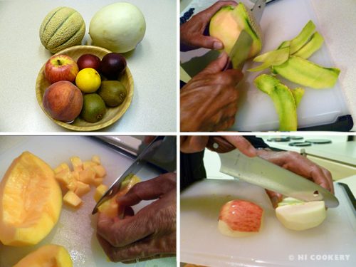 We visited Islander’s brother in Rome, Italy, when he was there during one summer for his congregational council meeting. Her parents joined us from Hawaii and we decided to make this our wedding anniversary trip with the family. We met her brother’s superior general at the headquarters of the worldwide order, toured St. Peter’s Basilica/Square in Vatican City, went sightseeing all over Rome (Colosseum, Pantheon, churches, Spanish Steps, Trevi Fountain, squares, catacombs, etc.) and ate extremely well! The food in Italy was delicious and we frequently cooled off with gelato for dessert. But sometimes we wanted to eat a “lite” treat after touring around and sweating in the summer heat. Macedonia di frutta (marinated fruit) was a great option to enjoy chilled seasonal fruit slightly sweetened with sugar and lemon juice (or, for the cocktail version, white wine).