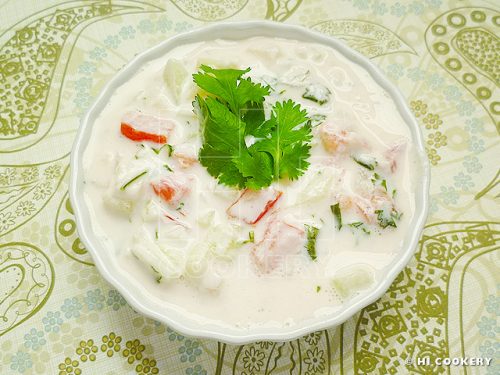 - There are different variations of raita. Some recipes call for scallions instead of round onions, mint instead of cilantro and cumin or coriander instead of garlic powder. A few raitaare sprinkled with red chili pepper, which Islander thinks would defeat the dish’s cooling properties.