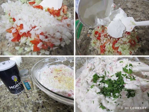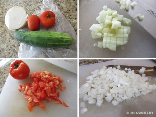 Wash, dry, peel and chop the cucumbers. Chop the tomatoes and onion. Place all in a large bowl.